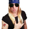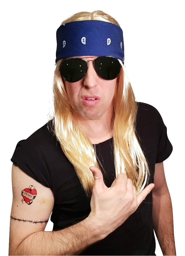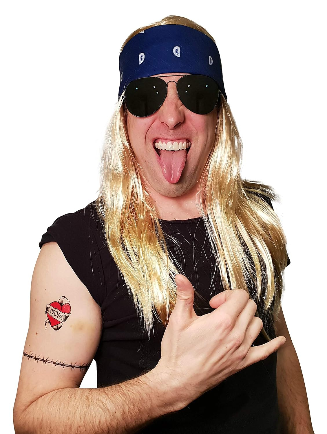 The Rocker Wig is the hottest piece since kiss! Your search ends here, Everything you need to rock out this weekend is here.Beautiful Blonde Hair that even makes the ladies jealous, Aviator Glasses that will block out every eye trying to get into your fame, a Classic Blue Bandanna to hold your wig down when your waving your hair like you just don’t care, and finally Tattoos are included to put the final touch of creativity on this masterpiece. Barb wire and I love mom! This Costume is your one stop shop for EVERY event