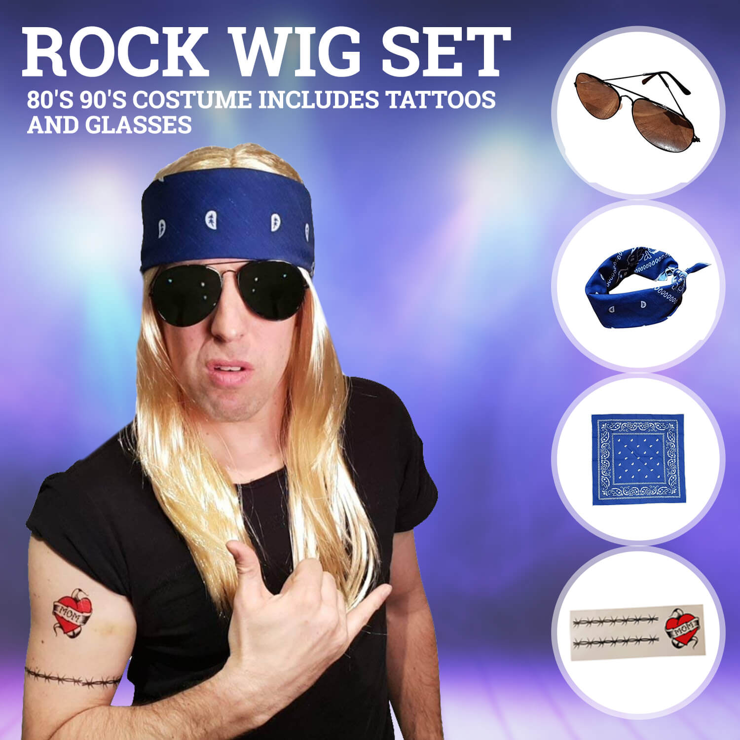 Rock Wig Set for Punk Heavy Metal Rocker Party 80’s 90’s Costume includesTattoos and Glasses